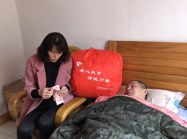 2月26日,正值2018 新春佳節(jié)之際,山東省扶貧開發(fā)基金會(huì)秘書長王景輝,洪力網(wǎng)副總經(jīng)理?xiàng)瞵?,副秘書長、山東天使健康救助聯(lián)盟秘書長、山東廣播電視臺(tái)《公益山東》副制片人晁玉萍等在山東省血液中心獻(xiàn)血辦主任王淑榮的陪同下,專程從濟(jì)南趕往淄博市張店區(qū)看望和慰問因重病陷入困境的無償獻(xiàn)血者張明豹。
