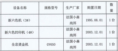 2、NL650新六色機(jī)(3#)、GV650新六色凹印機(jī)(4#)、全息燙金機(jī)各1臺(tái),整體拍賣,起拍價(jià)334.344萬元,競買保證金65萬元;